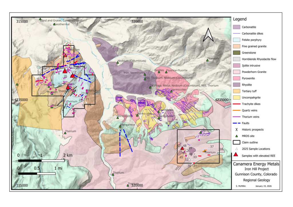 Edmonton, Alberta – January 26, 2026 – Canamera Energy Metals Corp. (CSE:EMET | OTCQB:EMETF | FSE:4LF0) (“Canamera” or the “Company”) reports that it has received from American Assay Laboratories the over-limit analysis for rock samples collected during the Company’s prospecting program on the Iron Hills Project located in Gunnison County, Colorado, U.S.A.