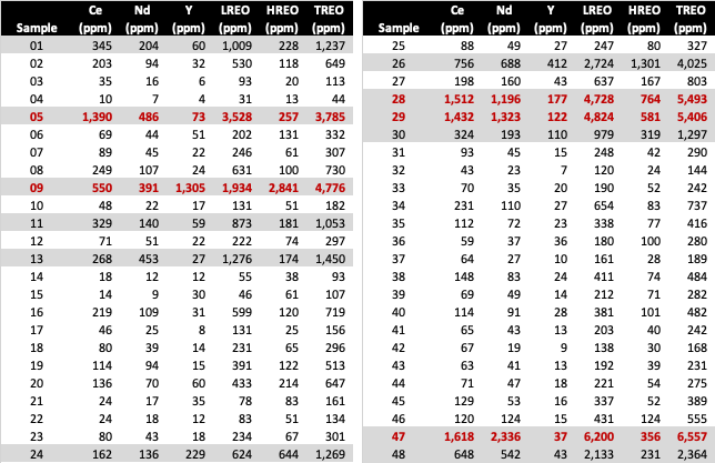 Five of the 48 samples collected returned values that exceeded the initial detection limits for cerium (Ce), neodymium (Nd), and yttrium (Y). Follow-up analysis using sodium peroxide fusion has now returned quantitative results for these over-limit samples. Sample 47 returned the highest total rare earth oxide (“TREO”) value of 6,557 ppm (0.66% TREO), including 2,336 ppm Nd. Sample 09 returned the highest heavy rare earth oxide (“HREO”) value of 2,841 ppm, driven by 1,305 ppm Y. Factoring in these updated values, a total of six samples have now returned TREO values in excess of 3,000 ppm (0.3% TREO). Full results are presented in Table 1, with the re-assayed over-limit results highlighted in red. Sample locations are shown in Figure 1.