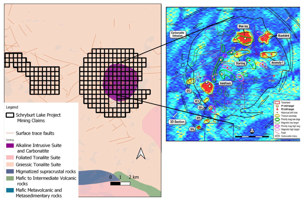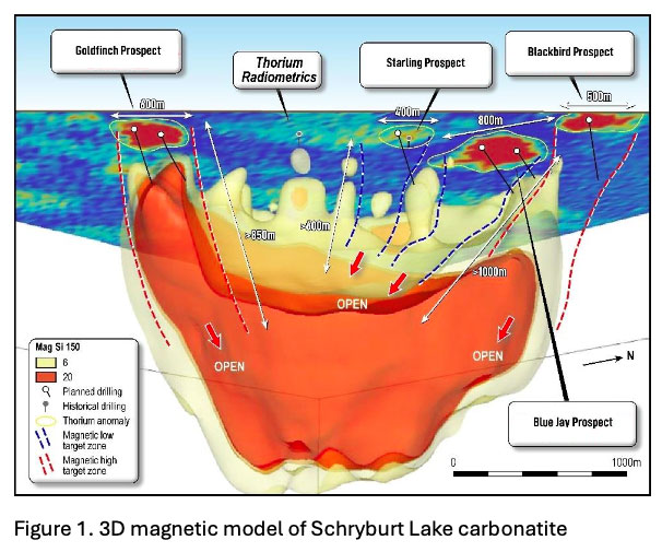 Schryburt Lake presents indications of a multi-centre, carbonatite-hosted rare earth element (“REE”) and niobium (“Nb”) system with four priority targets—Blue Jay, Goldfinch, Blackbird and Starling—each defined by the coincidence of kilometre-scale thorium radiometric anomalies and deep three-dimensional magnetic bodies, supported by historical and recent exploration. Collectively, these prospects outline the potential for a vertically extensive REE-Nb system developed in multiple centres around the carbonatite complex.