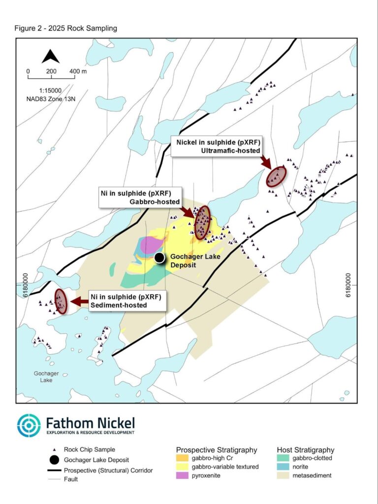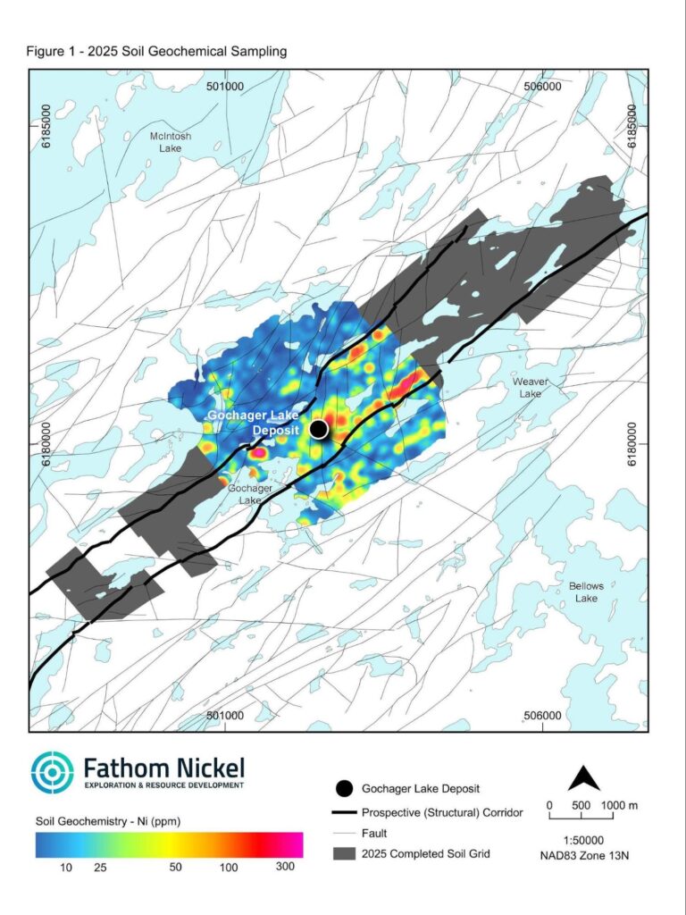 - Elevated Ni in disseminated to semi-massive sulphide mineralization within a metasediment host was detected approximately 800m west-southwest of the historic Gochager Lake deposit. It is within this area that the highest Ni-in soil sample was collected (Fathom Press Release July 21, 2025).