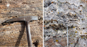 Figure 4. Left: Representative outcrop photo of finely laminated silica sinter with abundant palisade textures and packed fragmental layers. Right: Silica sinter with radiating algal mounds interpreted to represent a near-vent environment.