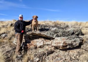 Brent Cook on site at Headwater’s Midas North project in Nevada with “Gunner the Sinter Lab”