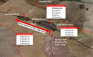- Very strong gold values in Headwater rock grab samples (up to 170.00 g/t Au) in a high-level epithermal environment.