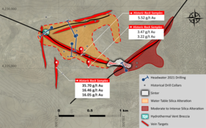 Figure 2: Principal vein targets at the Spring Peak Project relative to drill traces of completed 2021 Headwater drill holes, key geologic features and select historic rock sampling highlights.