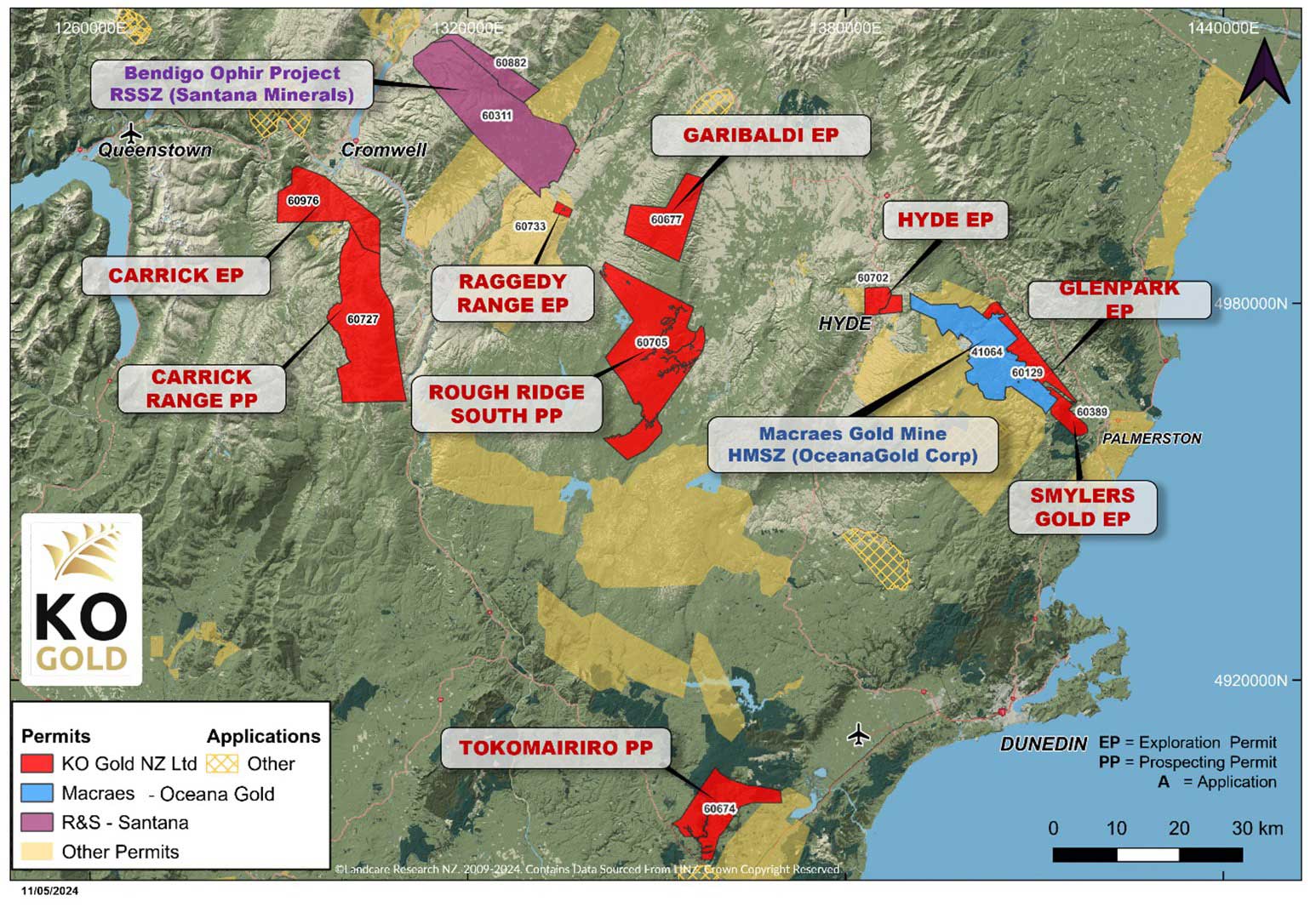 Toronto, Ontario – June 17, 2024 – KO Gold Inc. (CSE:KOG) (“KO Gold” or the “Company“) is pleased to announce its drilling plans in the Otago Gold District in New Zealand. The Company plans to initially complete reverse circulation (RC) and diamond drill holes on its Carrick, Hyde, Smylers, and Glenpark exploration permits (EP) over the next few months. This drilling program will focus on: (1) the discovery of high-grade mineralized shear zones or lode gold within the Carrick Goldfield, located southwest of Santana Minerals’ Bendigo-Ophir Gold Project within the Rise & Shine Shear Zone (“RSSZ”), and (2) testing the extensions of the Hyde-Macraes Shear Zone (“HMSZ”) adjacent to OceanaGold’s active Macraes Gold Mine (Figure 1).