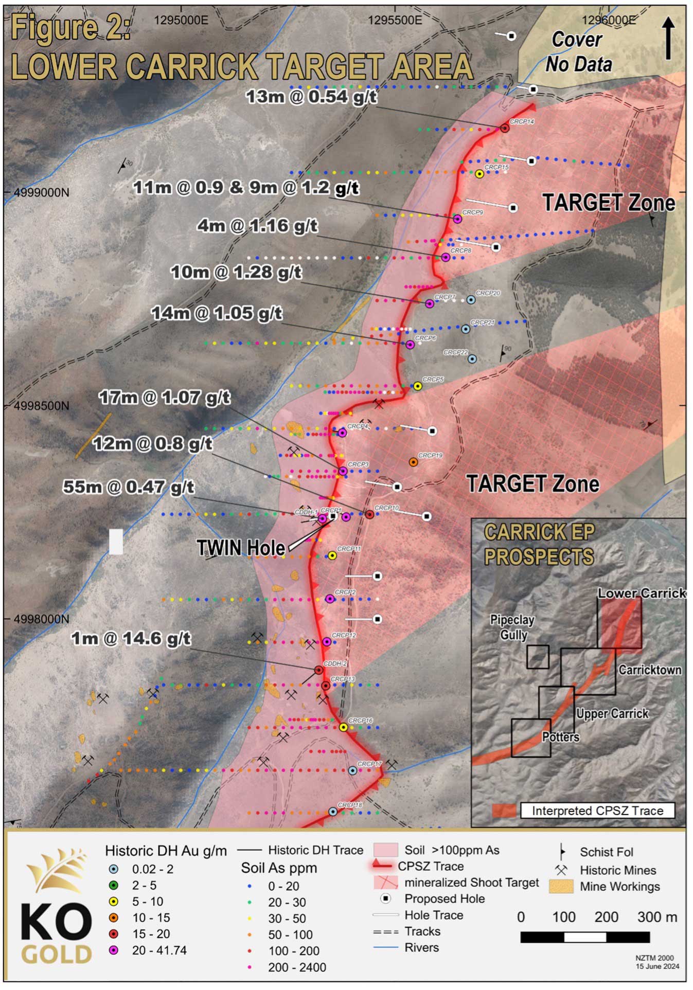 Figure 2: Lower Carrick Target historical results within Carrick-Potter Shear Zone (CPSZ)