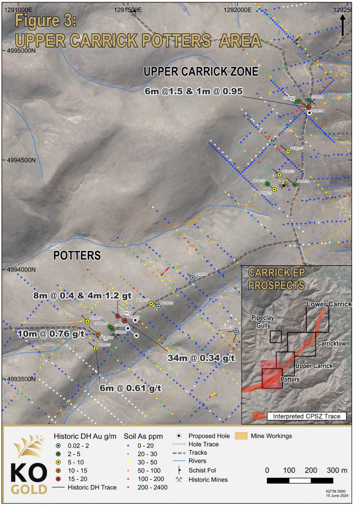 - Up to 18 drill holes are planned on the Carrick EP within the Carrick Goldfield targeting high-angle, lode-style gold mineralization and low-angle, shear-hosted gold mineralization within the Carrick-Potter Shear Zone (CPSZ) (Figure 2). Historical drilling intercepted several mineralized intercepts grading between 1 to 4 g/t Au over 3 to 17 m including higher grade intervals of 7.4 g/t Au and 14.5 g/t Au over 2 m. KO Gold will test extensions to gold mineralization in the Lower Carrick, Upper Carrick, and Potters targets through step-out drilling (Figure 3). Drill holes are located on both private and Department of Conservation (DOC) lands and will require access agreements prior to drilling. The Company has submitted a minimum impact activity (MIA) application to DOC for surface exploration work at Carrick and is working on an access agreement.