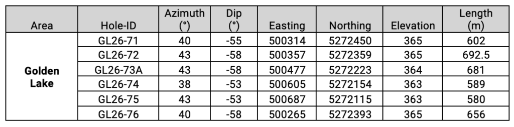 - Drill hole GL 26-73A at Golden Lake has intersected 0.67 g/t gold over 136 metres (“m”), this includes 19.55m of 1.51 g/t gold and 51.35m of 0.78 g/t gold. See Figure 2 and Tables 1 and 2.