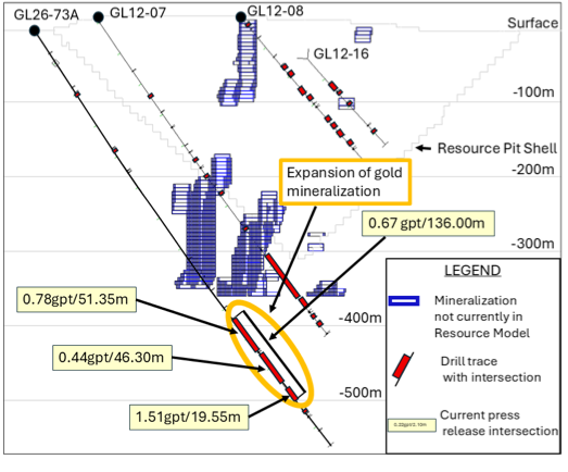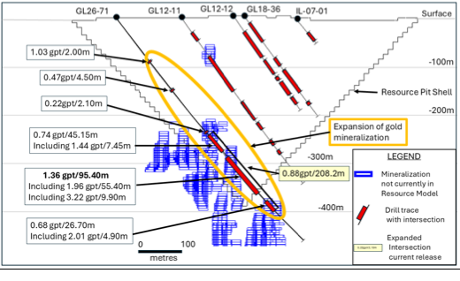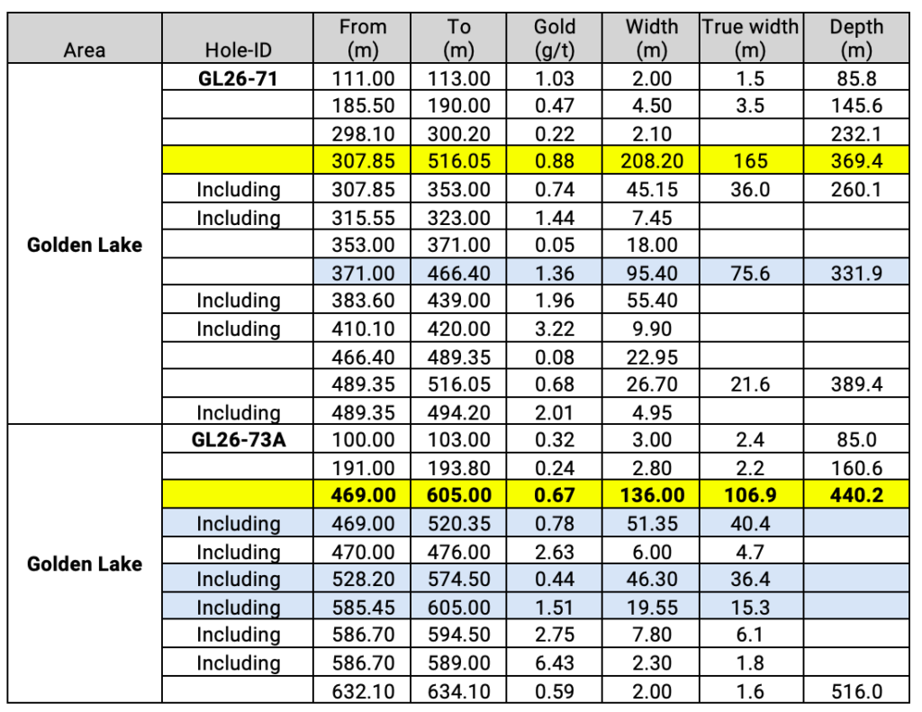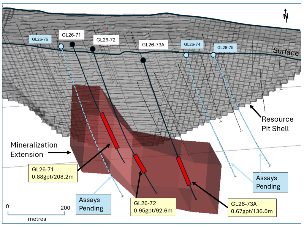 - Previously announced drill hole GL 26-71(95.4m of 1.36 g/t gold – March 2, 2026) has been updated and restated after study of the assays and drill core. A new intersection of 208.2m containing 0.88 g/t gold is announced. See Figure 3 and Tables 1 and 2. This includes: