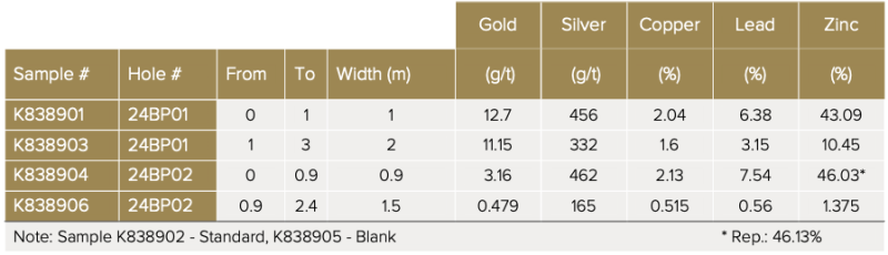The first 0.9 metres (2.95 ft) of Hole 24BP02 intersected massive sulphides comprising brown sphalerite, galena, chalcopyrite and pyrite. This interval assayed 3.16 g/t Au, 462 g/t Ag, 46.03% Zn, 7.54% Pb, and 2.13% Cu. The remaining 1.5 metres (4.9 ft) intersected fractured/rehealed limestone (marble) with a matrix of sulphides, including brown sphalerite, galena, chalcopyrite and pyrite. This interval assayed 1.375% Zn, 0.56% Pb, 0.515% Cu, 0.479 g/t Au and 165 g/t Ag.
