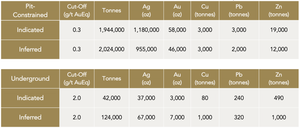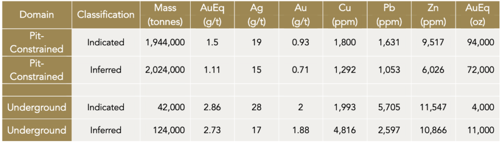 - Underground Indicated: 0.042 Mt grading 2.86 g/t AuEq containing 4,000 oz AuEq.
