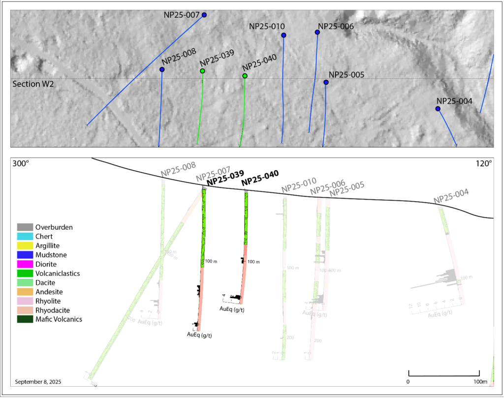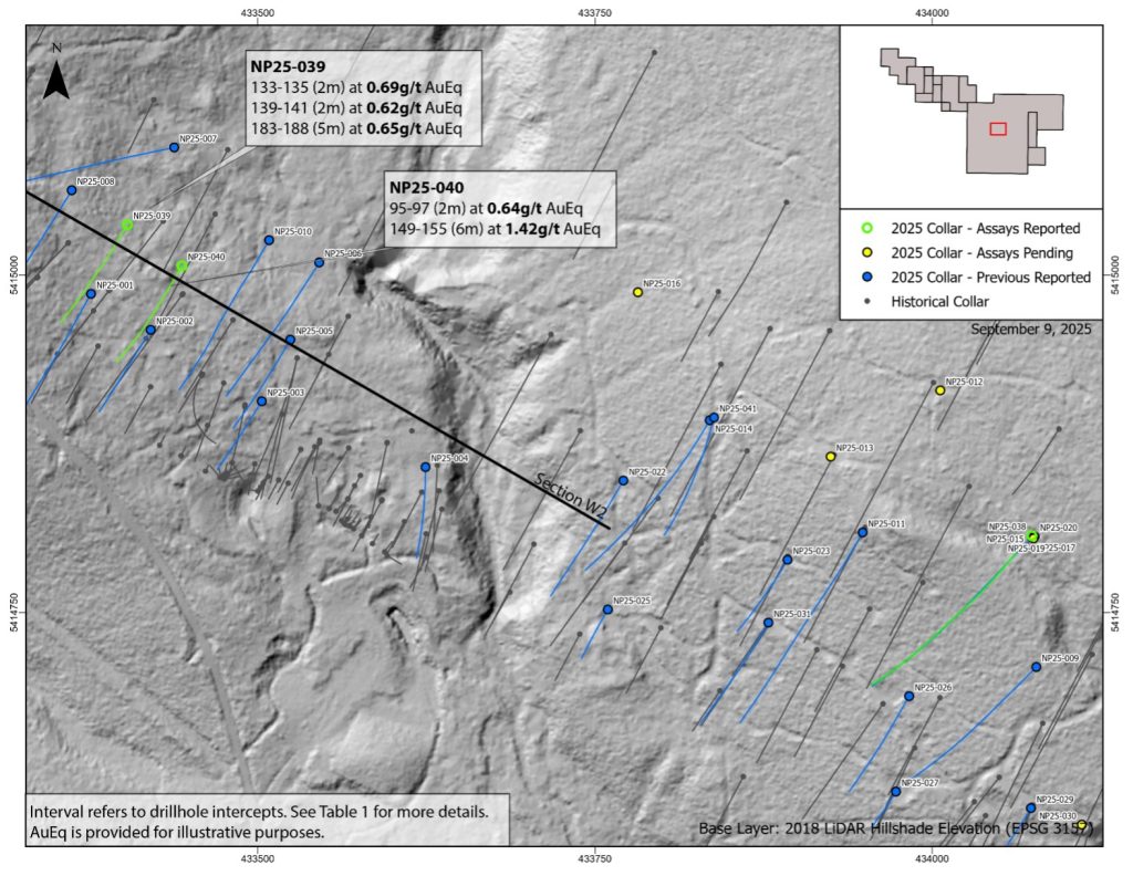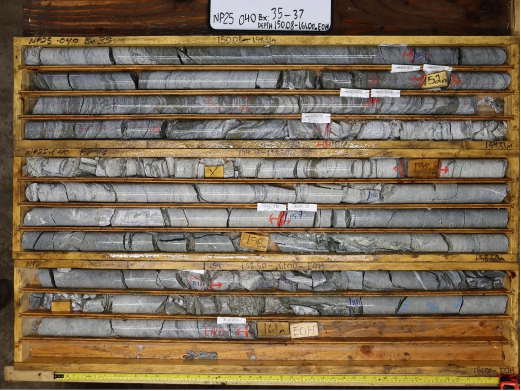 - NP25-040 intersected 6.0 m grading 1.42 g/t AuEq or 3.56% ZnEq (0.77 g/t Au, 0.71% Zn, 7.5 g/t Ag, 0.32% Cu, 0.04% Pb) from 149.0 m downhole.