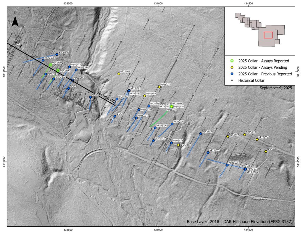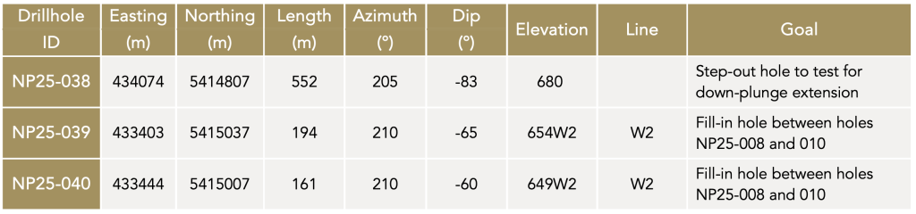 Two of the drillholes reported in this release (summarized in Tables 1 and 2) were drilled from section line W2 identified in Figures 1, 2, and 3, to evaluate mineralization beneath drillholes NP25-008 and 010 on the western end of the Coronation Zone. Both drillholes encountered the Coronation Zone at locations and grades consistent with nearby historical drilling. Hole NP25-038 is a step-out hole on the eastern side of the Coronation Zone, targeting a prospective down-plunge extension to historical mineralization in the Company’s exploration model. The following provides context on the objectives and results for each hole within this target area: