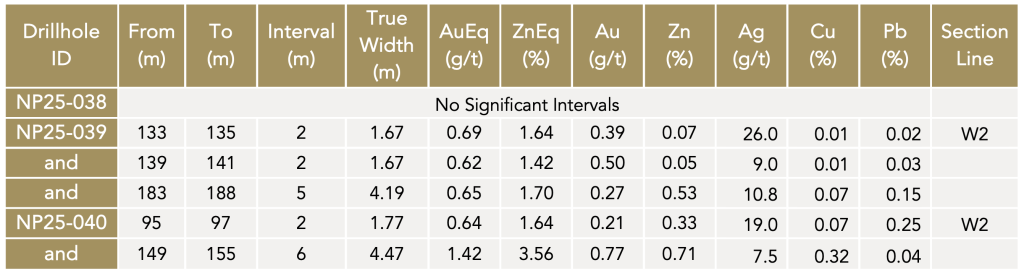 - NP25-039 intersected 5.0 m grading 0.65 g/t AuEq or 1.70% ZnEq (0.27 g/t Au, 0.53% Zn, 10.8 g/t Ag, 0.07% Cu, 0.15% Pb) from 183 m downhole.