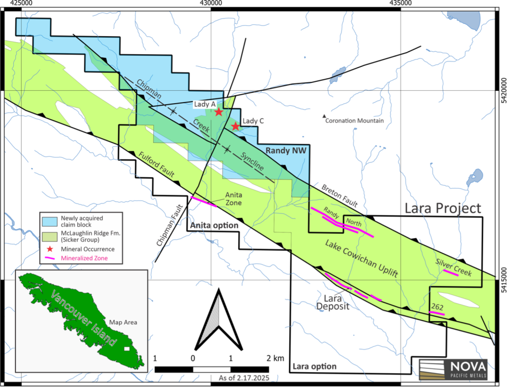Vancouver, British Columbia, Canada, February 19th, 2025 – Nova Pacific Metals Corp. (CSE: NVPC) (OTC: NVPCF) (FRA: YQ10) (WKN: A40GFH) (the “Company”, or “Nova Pacific”) is pleased to announce a strategic expansion of the Company’s flagship Lara Project on Vancouver Island, British Columbia. The new acquisition comprises three contiguous mineral claims with a combined area of approximately 976 hectares.