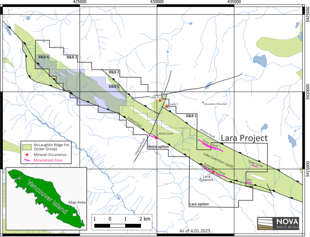 Vancouver, British Columbia, Canada, April 3, 2025 – Nova Pacific Metals Corp. (CSE: NVPC) (OTC: NVPCF) (FRA: YQ10) (WKN: A40GFH) (the “Company”, or “Nova Pacific”) is pleased to announce the staking of two additional claims (B&B 4 and 5) totaling 912.38 hectares contiguous with the existing property outline (Figure 1), following the completion of Dr. Tom Setterfield’s in-depth analysis of historical exploration results to the west of the Lara deposit.