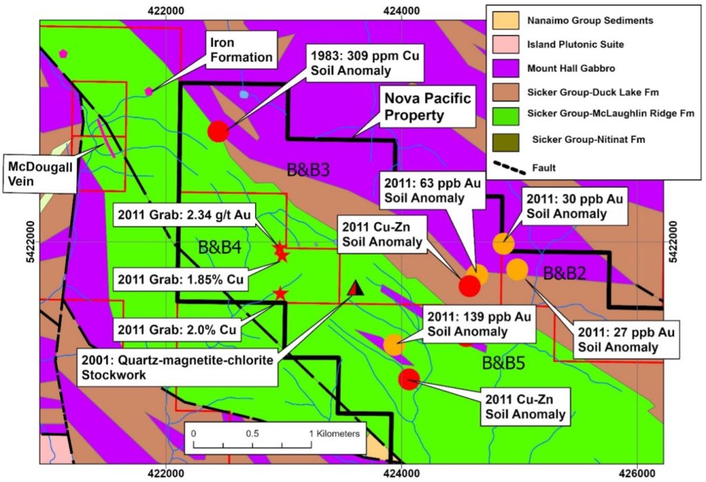 The northwest part of the property is predominantly underlain by the McLaughlin Ridge Formation, host to the Lara deposit and other volcanogenic massive sulphide (VMS) mineralization along strike. Nova Pacific now controls 17 km of this highly prospective stratigraphy. The northwest 7 km of strike length has received much less exploration attention than the southeast 10 km.