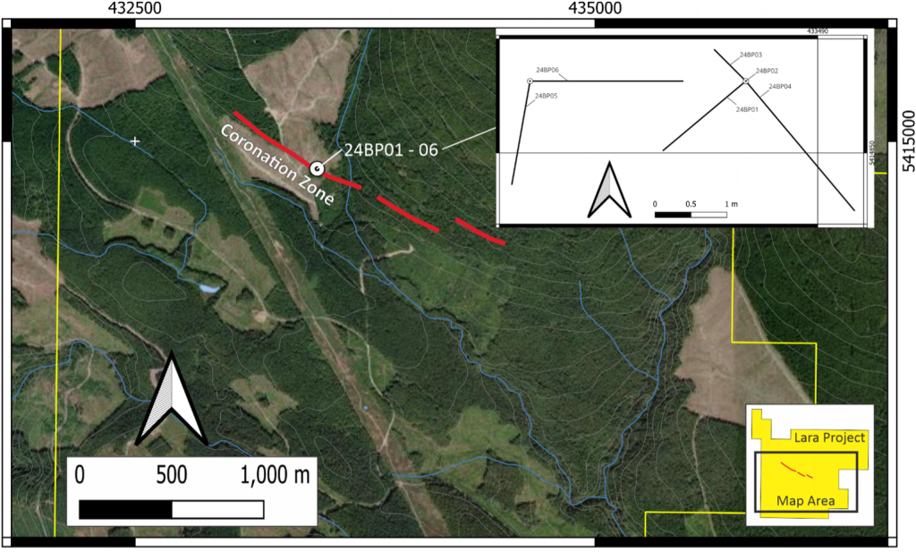 Vancouver, British Columbia, Canada, December 18, 2024 – Nova Pacific Metals Corp. (CSE: NVPC) (OTC: NVPCF) (FRA: YQ10) (WKN: A40GFH) (the “Company”, or “Nova Pacific”) is pleased to report complete results from a backpack drilling program carried out on the Company’s Lara Project on Vancouver Island, British Columbia. Six BQ-sized holes totalling 18.11 m were drilled from two closely spaced collars using a Shaw backpack drill in order to confirm historic grades and to collect modern trace geochemistry information for massive sulphide mineralization in the Coronation Zone (Figure 1). A discussion of results from holes 24BP01 and 02 appeared in a November 27, 2024 news release.