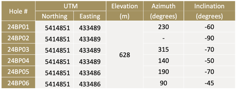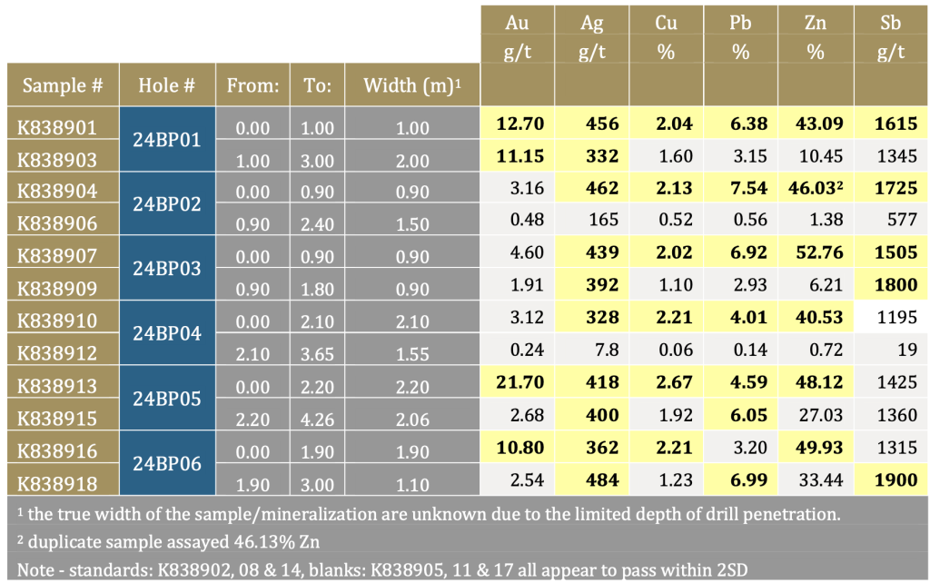 Assay results from holes 24BP03 – 06 (Table 2) further confirmed the high-grade nature of the massive sulphide lens exposed in nearby Trench 86-43 (24.58 g/t Au, 513.6 g/t Ag, 3.04% Cu, 43.01% Zn and 8.30% Pb across 3.51 m). Of particular note is the intersection from hole 24BP05, the upper 2.2 m of which intersected massive light brown sphalerite, galena, and disseminated chalcopyrite. Samples across the full 4.26 metre hole returned a weighted average of 12.5 g/t Au, 409.3 g/t Ag, 37.92% Zn, 5.29% Pb, 2.31% Cu and 1,394 g/t Sb. A 0.9 m intersection from hole 24BP03 also returned 52.76% Zn. These numbers compare favorably with Abermin’s trench results, but should not be considered representative of the average grade of the deposit, given the limited scope of the drilling program.