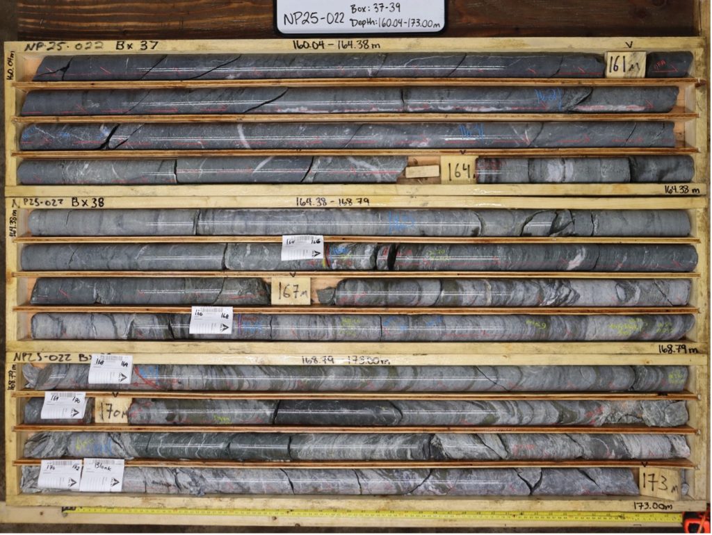 - NP25-022 intersected 12 m grading 1.7 g/t AuEq or 4.3% ZnEq (0.9 g/t Au, 0.07% Zn, 28 g/t Ag, 0.26% Cu, 0.18% Pb) from 166 m downhole