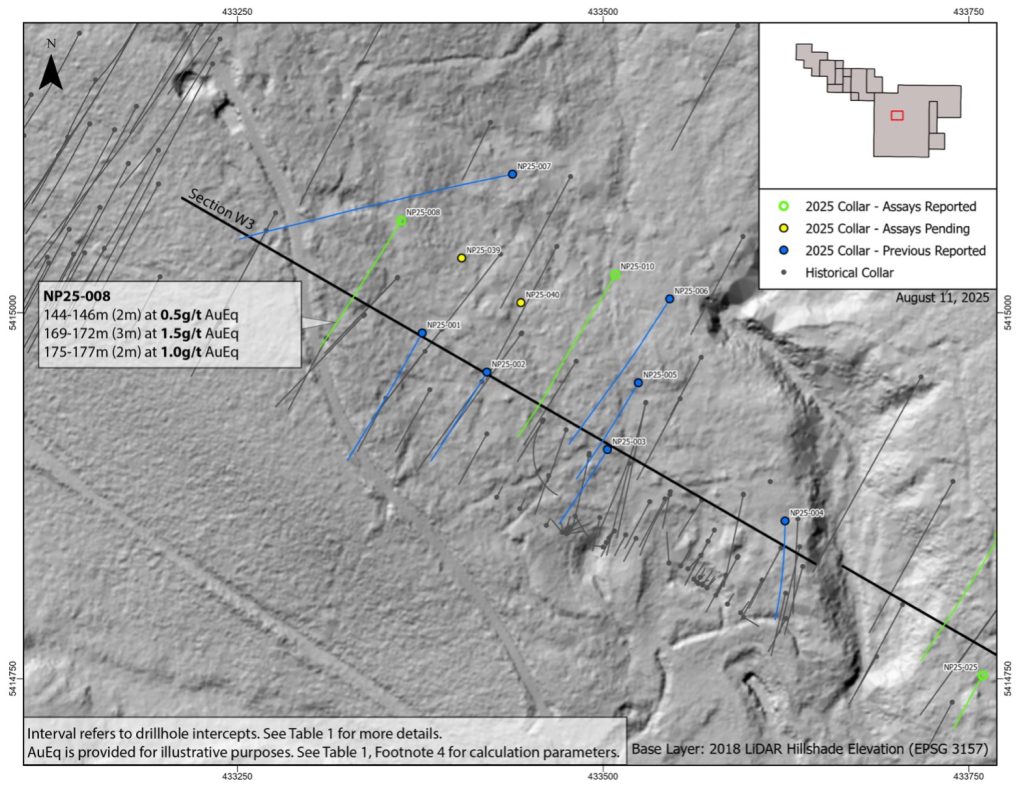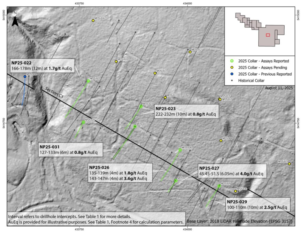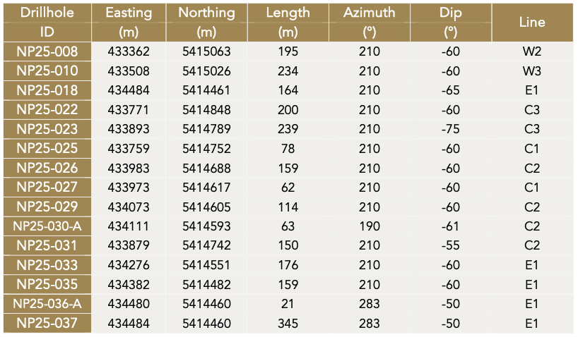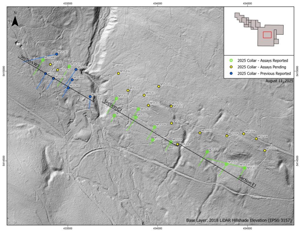 - Step-out holes with assays pending: NP25-009, NP25-015, NP25-021, NP25-038, and NP25-041: step-out holes designed to test for extensions beyond areas of mineralization identified by historical drilling.