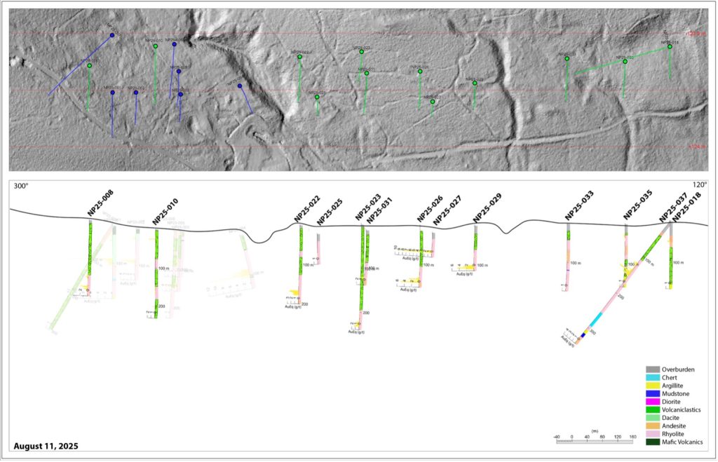 - Assays pending: NP25-011, NP25-012, NP25-013, NP25-014, and NP25-016: drilled to verify historical results in this area.
