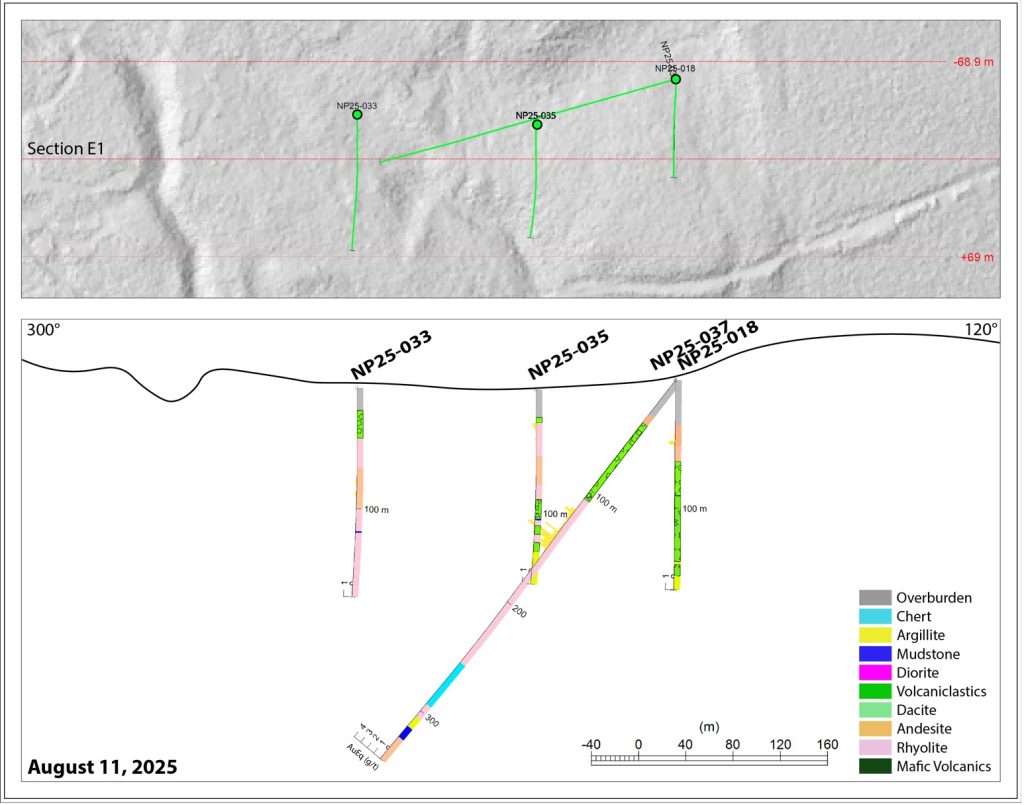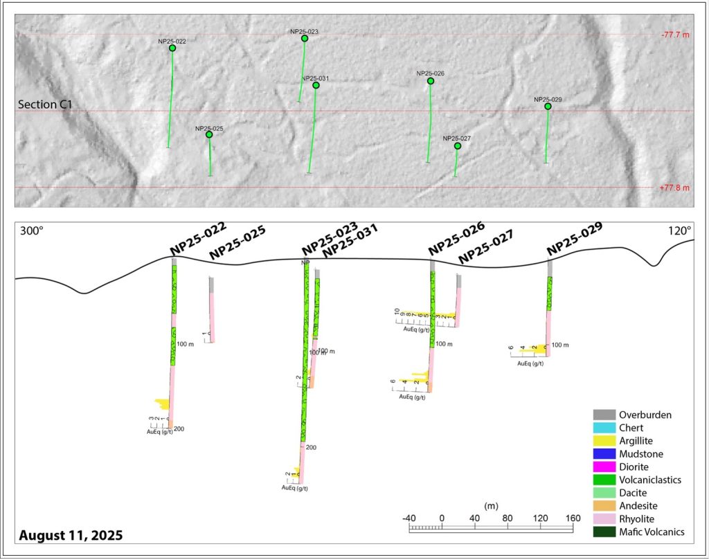 NP25-025 was drilled from section line C1 and intersected favourable alteration in rhyolite but did not encounter any significant intervals of mineralization. NP25-030-A was abandoned due to difficult ground conditions and was not redrilled.