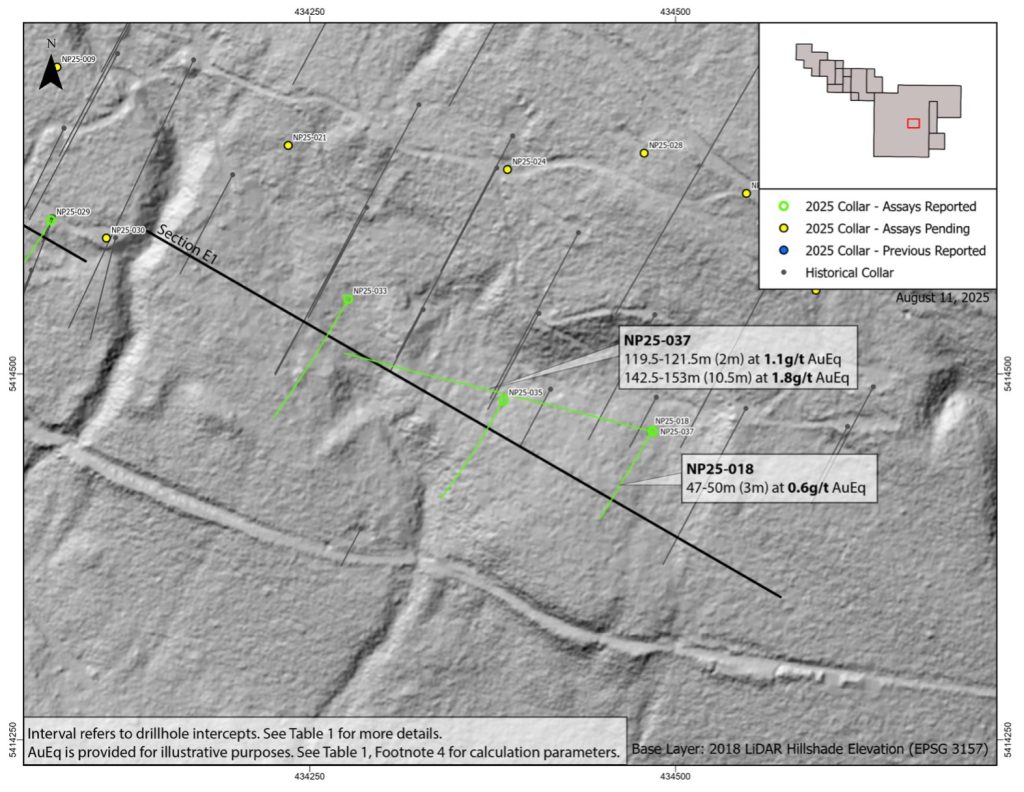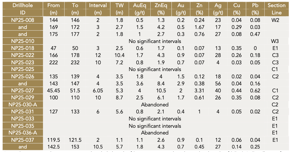 - NP25-037 intersected 10.5 m grading 1.8 g/t AuEq or 4.3% ZnEq (0.7 g/t Au, 0.45% Zn, 27 g/t Ag, 0.14% Cu, 0.25% Pb) from 119.5 m downhole
