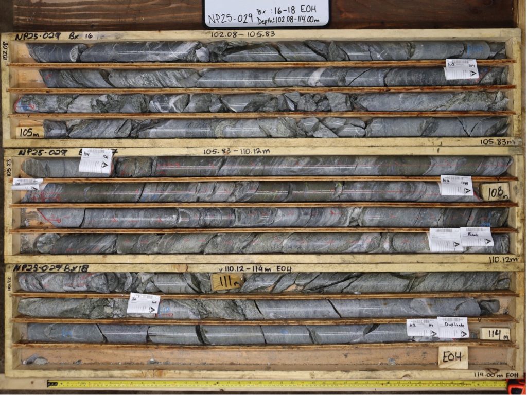 - NP25-031: 6 m grading 0.8 g/t AuEq (2.1% ZnEq); filled a gap in the model and confirmed down-plunge extensions to known historical mineralization in fault-hosted sulphide bearing quartz veins.